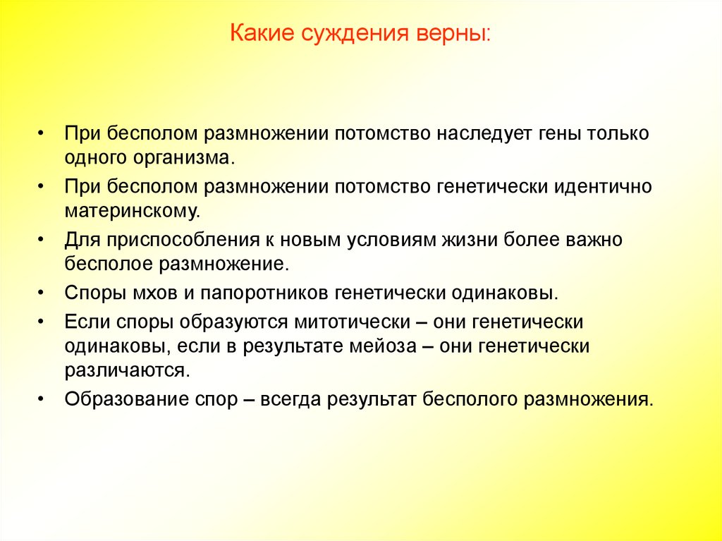 Какие суждения верны:• При бесполом размножении потомство наследует гены только