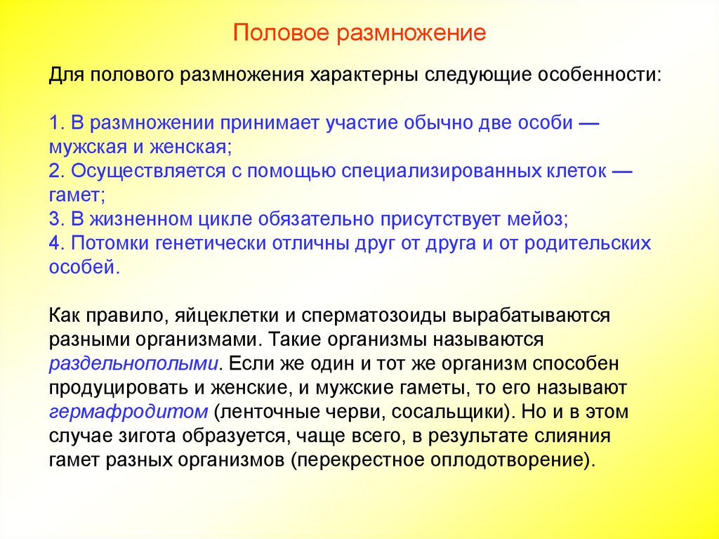 Половое размножениеДля полового размножения характерны следующие особенности: