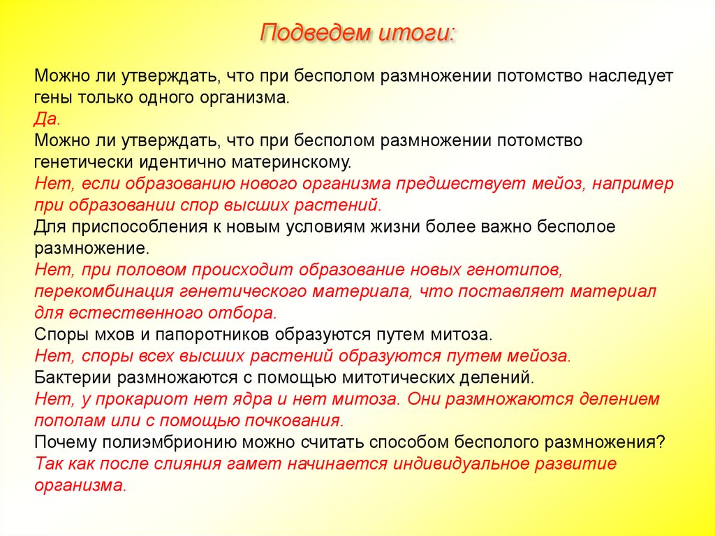 Подведем итоги:Можно ли утверждать, что при бесполом размножении потомство наследует