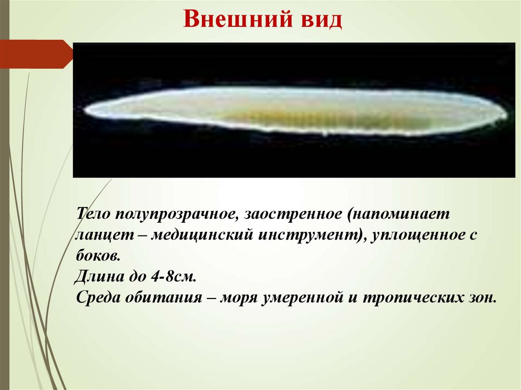 Внешний видТело полупрозрачное, заостренное (напоминает