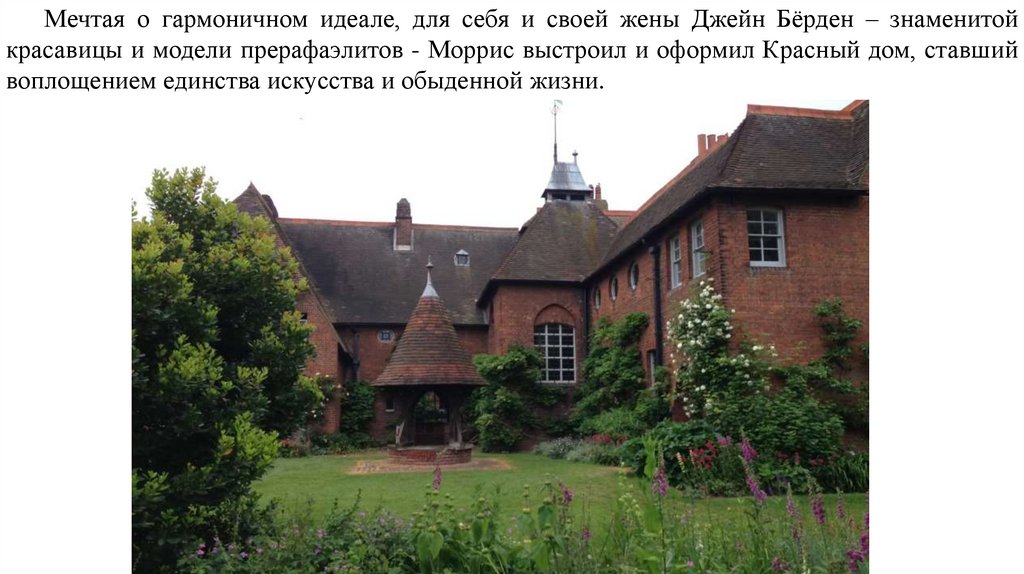 Мечтая о гармоничном идеале, для себя и своей жены Джейн Бёрден – знаменитойкрасавицы и модели прерафаэлитов - Моррис выстроил и оформил Красный дом, ставший