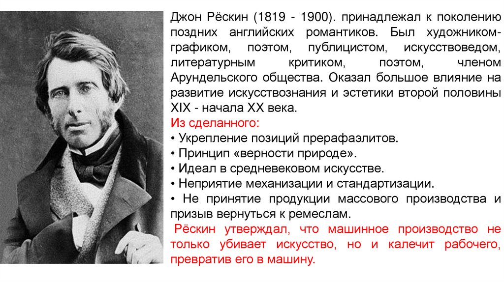 Джон Рёскин (1819 - 1900). принадлежал к поколениюпоздних английских романтиков. Был художникомграфиком, поэтом, публицистом, искусствоведом,