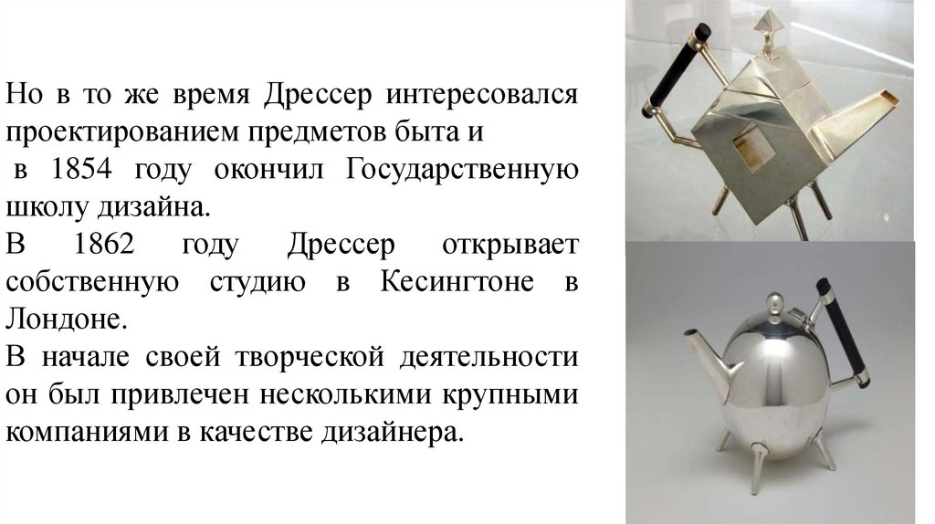 Но в то же время Дрессер интересовалсяпроектированием предметов быта и