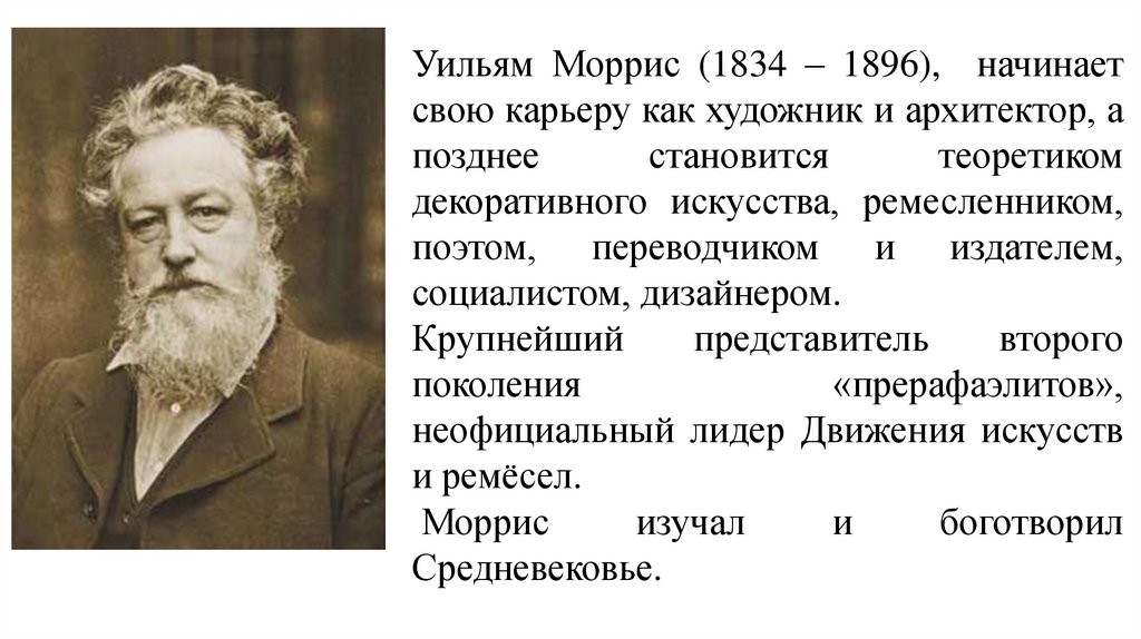 Уильям Моррис (1834 – 1896), начинаетсвою карьеру как художник и архитектор, а