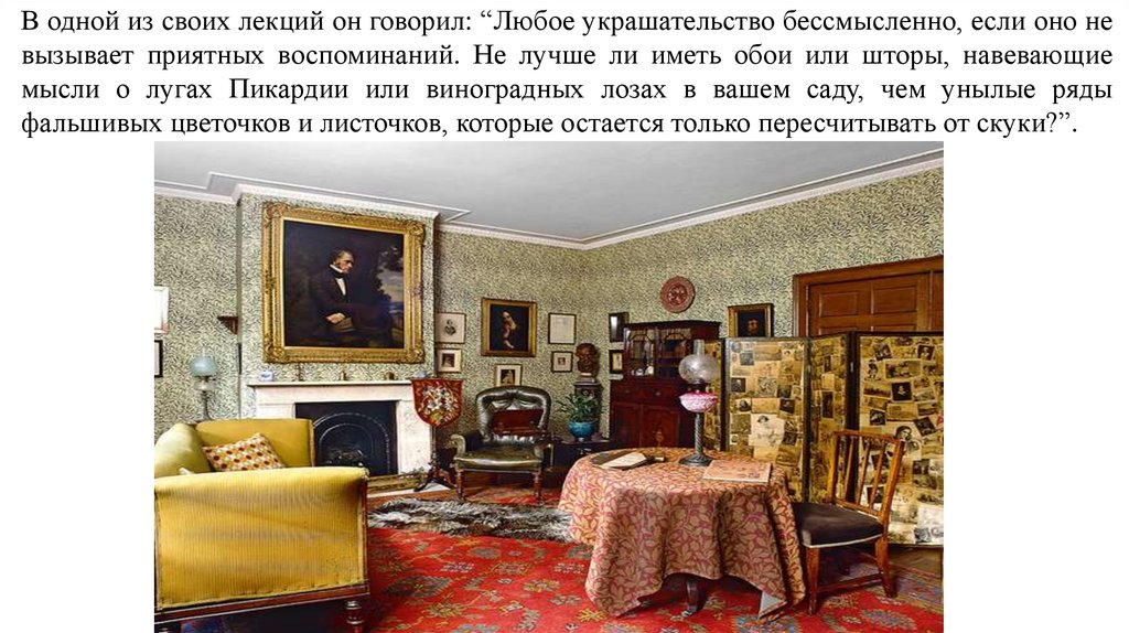 В одной из своих лекций он говорил: “Любое украшательство бессмысленно, если оно невызывает приятных воспоминаний. Не лучше ли иметь обои или шторы, навевающие