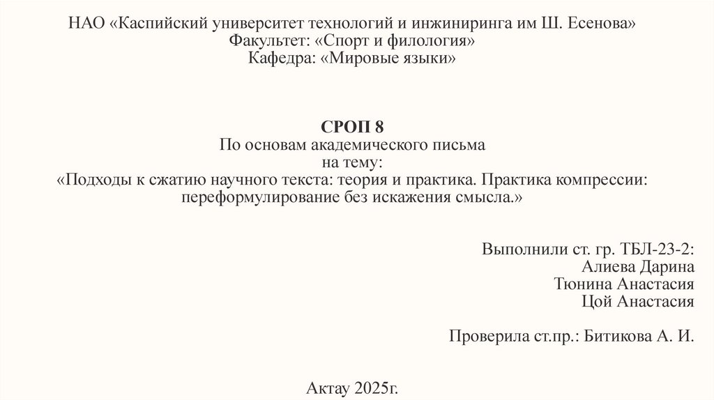 НАО «Каспийский университет технологий и инжиниринга им Ш. Есенова»Факультет: «Спорт и филология»