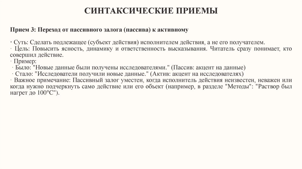 СИНТАКСИЧЕСКИЕ ПРИЕМЫПрием 3: Переход от пассивного залога (пассива) к активному