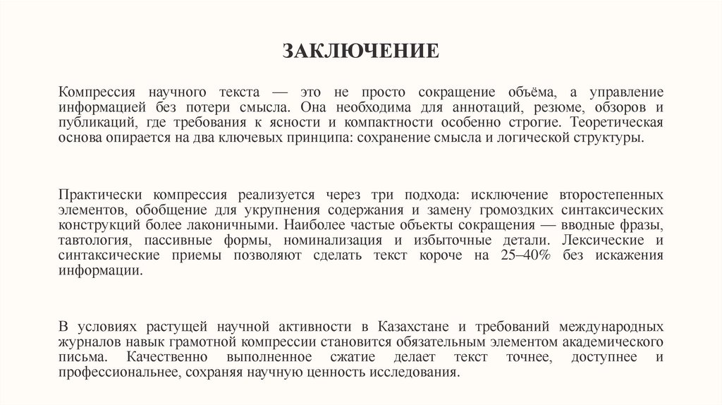 ЗАКЛЮЧЕНИЕКомпрессия научного текста — это не просто сокращение объёма, а управление