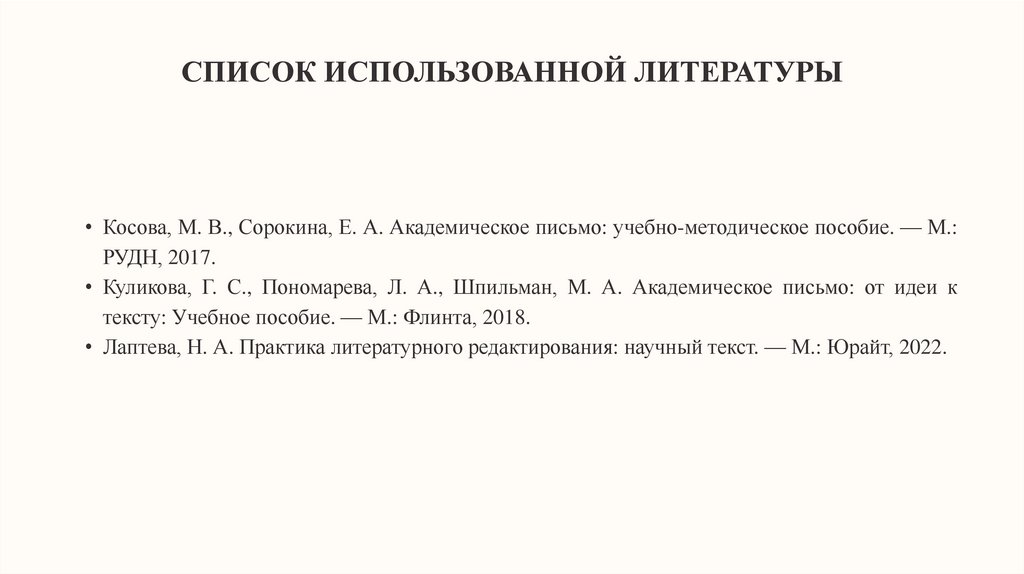 СПИСОК ИСПОЛЬЗОВАННОЙ ЛИТЕРАТУРЫ• Косова, М. В., Сорокина, Е. А. Академическое письмо: учебно-методическое пособие. — М.: