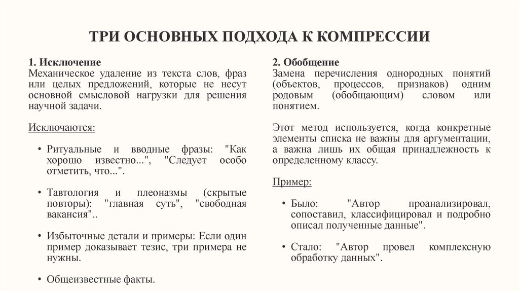 ТРИ ОСНОВНЫХ ПОДХОДА К КОМПРЕССИИ1. Исключение