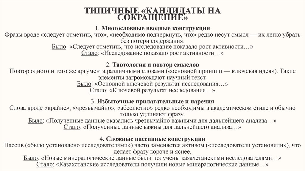 тавтология, пассивные формы, номинализация и избыточные детали. Лексические и