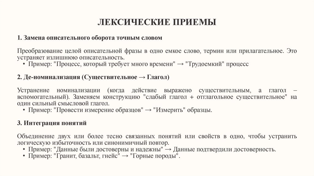 ЛЕКСИЧЕСКИЕ ПРИЕМЫ1. Замена описательного оборота точным словом