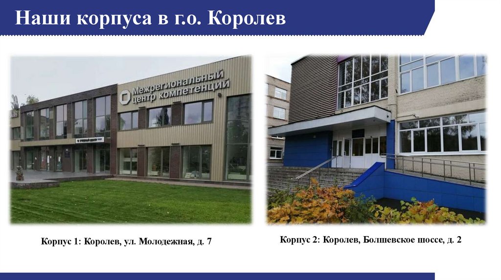 Наши корпуса в г.о. КоролевКорпус 1: Королев, ул. Молодежная, д. 7