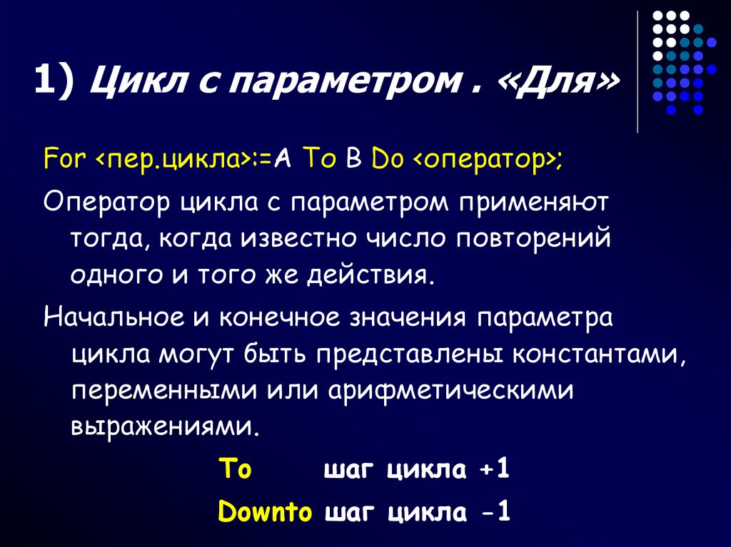 For <пер.цикла>:=А То В Do <оператор>;Оператор цикла с параметром применяют