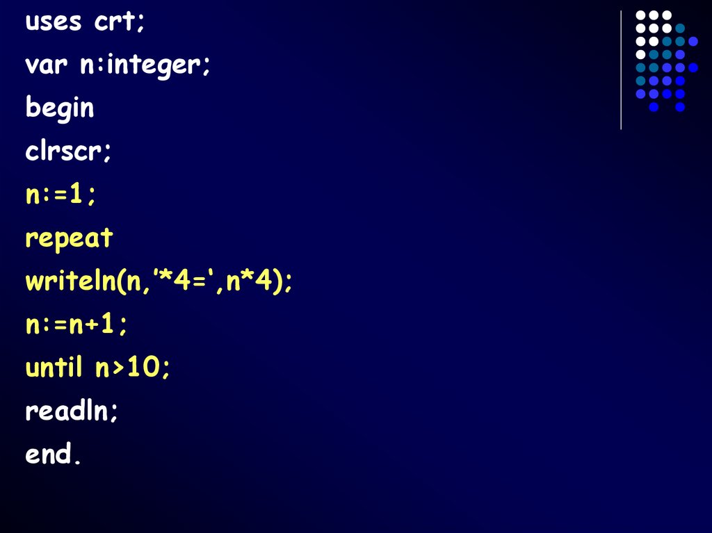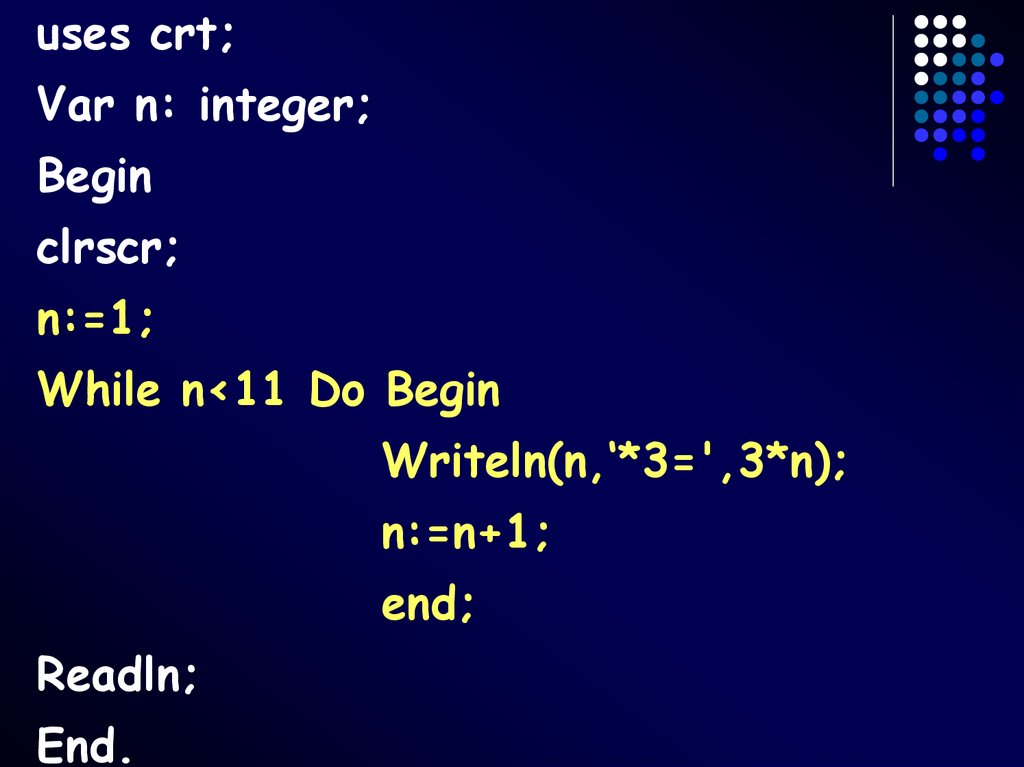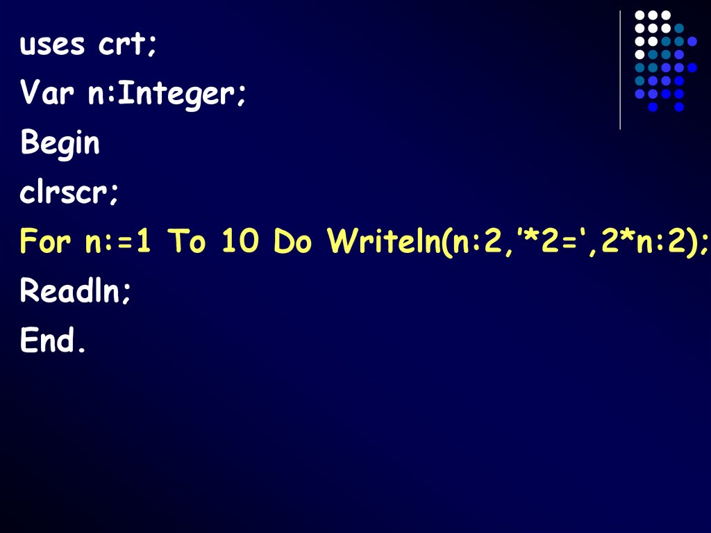 For n:=1 To 10 Do Writeln(n,’*2=‘,2*n);