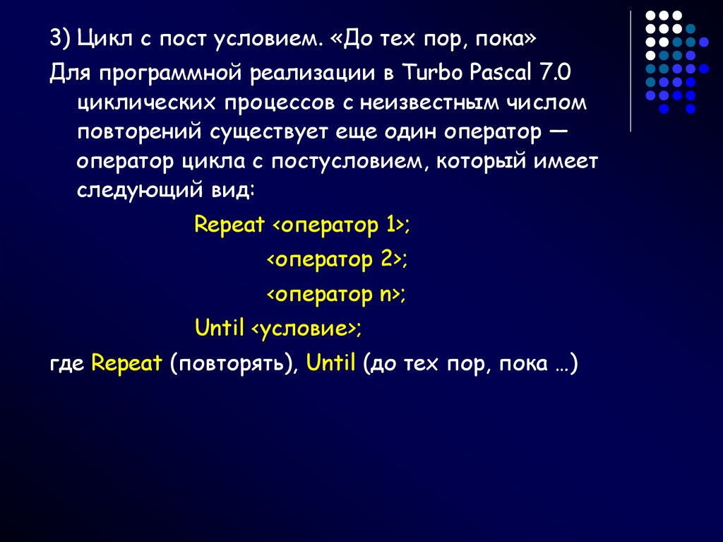 3) Цикл с пост условием. «До тех пор, пока»Для программной реализации в Turbo Pascal 7.0