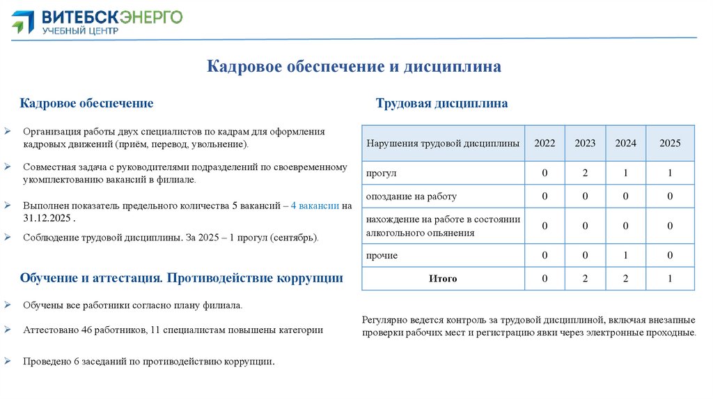 Соблюдение трудовой дисциплины. За 2025 – 1 прогул (сентябрь).