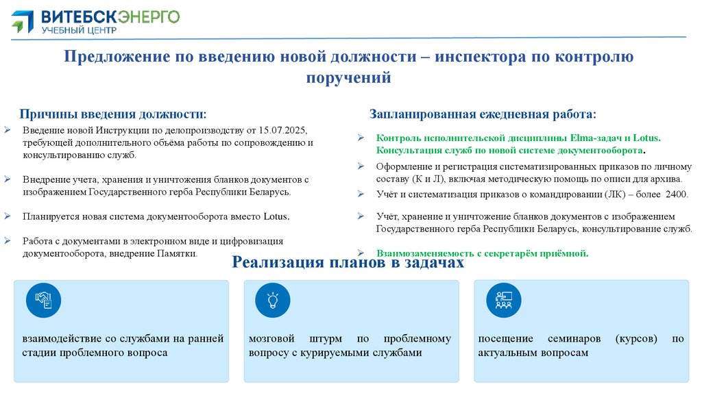 Предложение по введению новой должности – инспектора по контролюпоручений