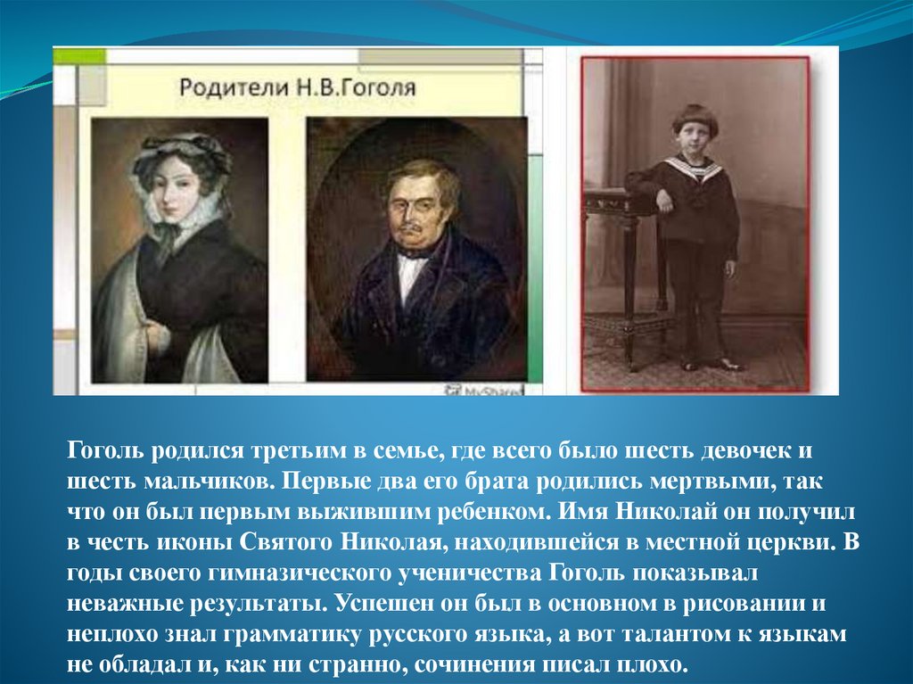 Гоголь родился третьим в семье, где всего было шесть девочек ишесть мальчиков. Первые два его брата родились мертвыми, так