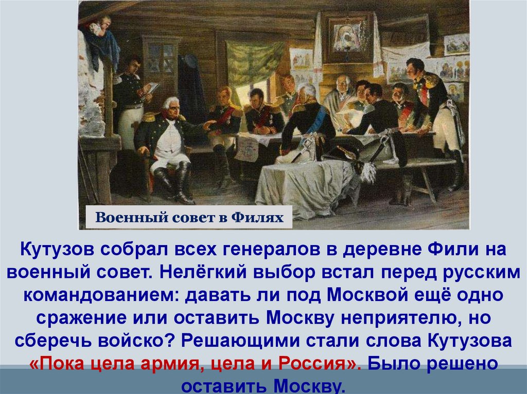 Военный совет в ФиляхКутузов собрал всех генералов в деревне Фили на