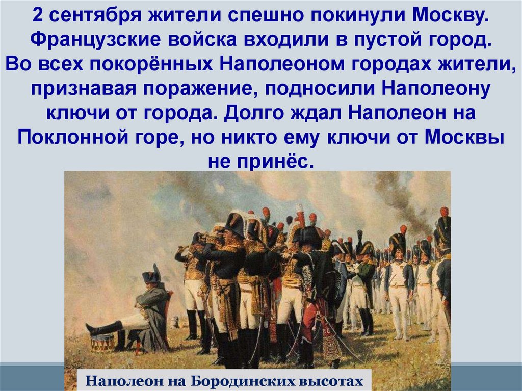 2 сентября жители спешно покинули Москву.Французские войска входили в пустой город.