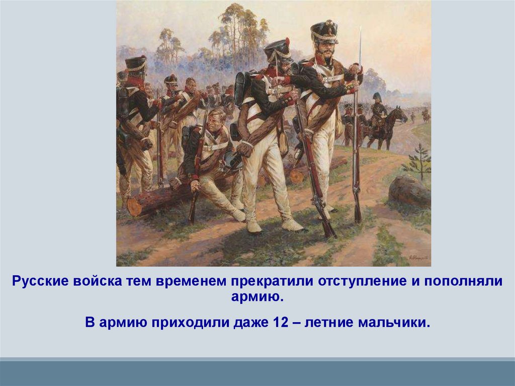 Русские войска тем временем прекратили отступление и пополнялиармию.