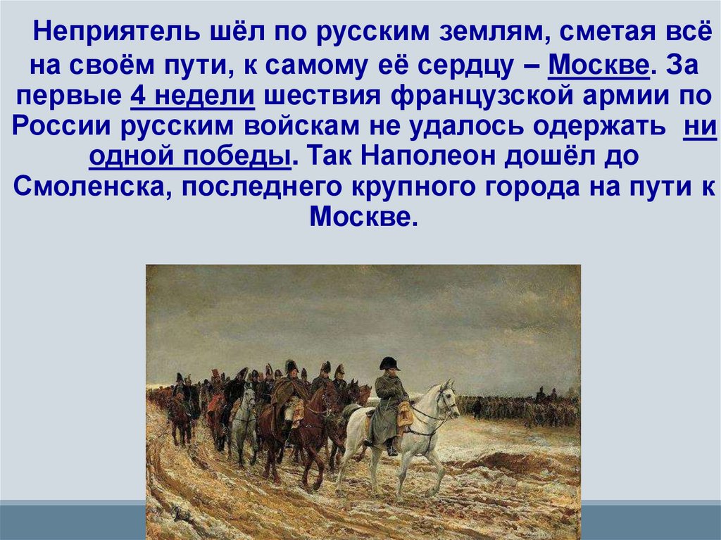Неприятель шёл по русским землям, сметая всёна своём пути, к самому её сердцу – Москве. За