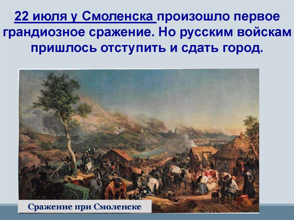 22 июля у Смоленска произошло первоеграндиозное сражение. Но русским войскам