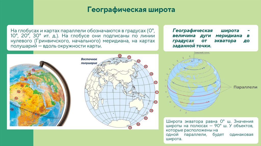 экватора к Южному полюсу — от 0° до 90°. Градусную меру параллелей обычно