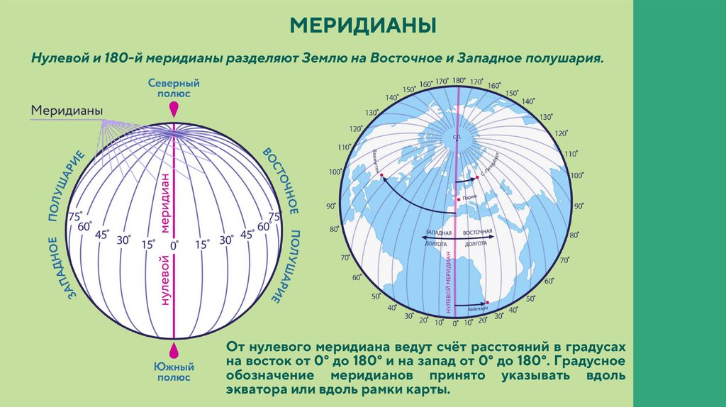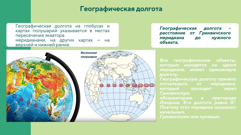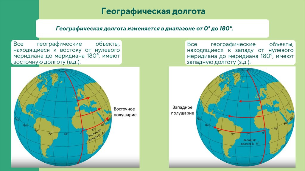 Географическая долготаГеографическая долгота изменяется в диапазоне от 0° до 180°.