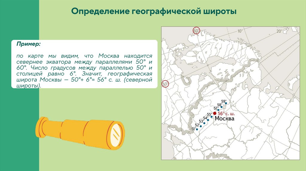 широта Москвы — 50°+ 6°= 56° с. ш. (северной