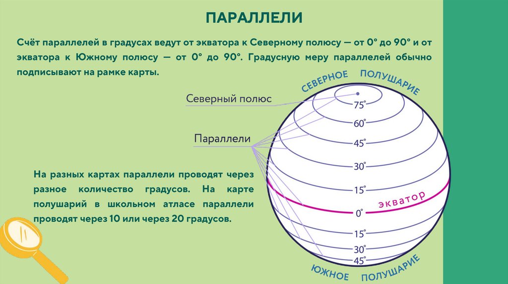 ПАРАЛЛЕЛИСчёт параллелей в градусах ведут от экватора к Северному полюсу — от 0° до 90° и от
