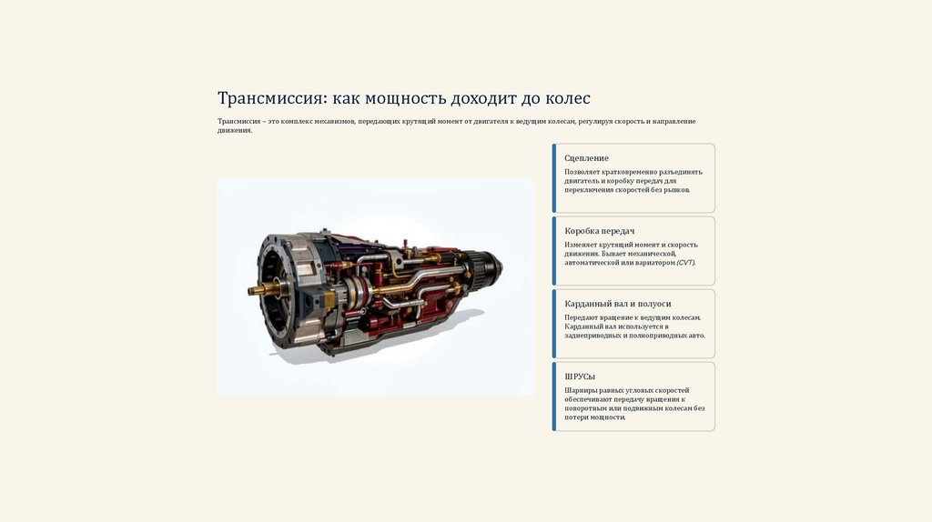 Трансмиссия: как мощность доходит до колесТрансмиссия – это комплекс механизмов, передающих крутящий момент от двигателя к ведущим колесам, регулируя скорость и направление