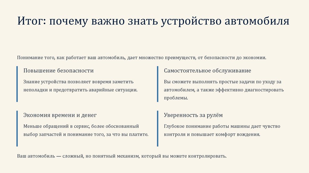 Итог: почему важно знать устройство автомобиляПонимание того, как работает ваш автомобиль, дает множество преимуществ, от безопасности до экономии.