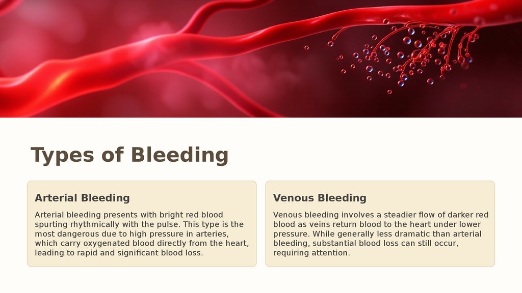 Arterial bleeding is rapid and bright red, venous bleeding is a