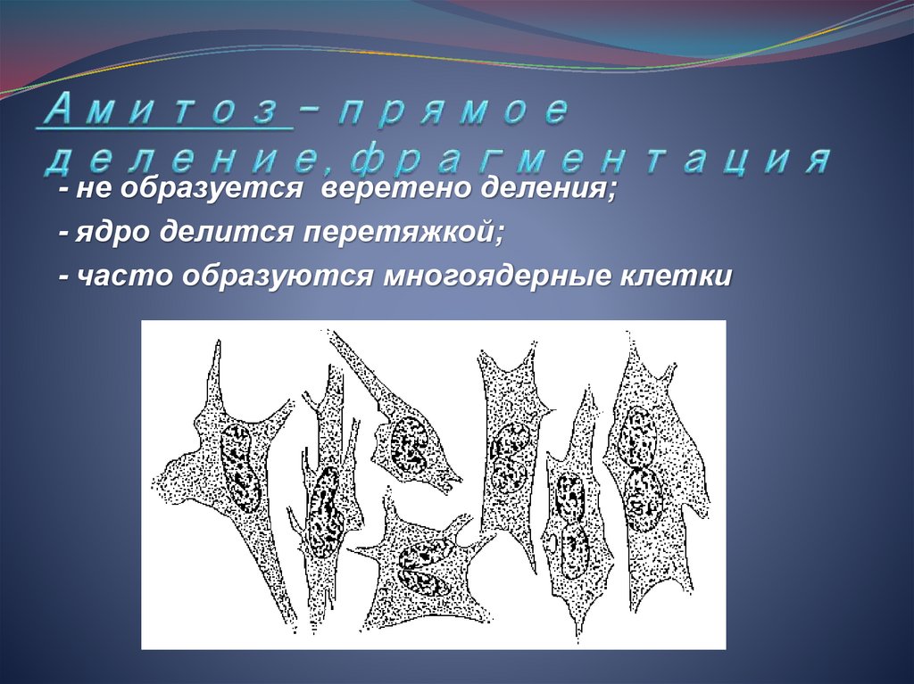 - не образуется веретено деления;- ядро делится перетяжкой;