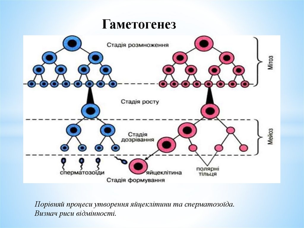 ГаметогенезПорівняй процеси утворення яйцеклітини та сперматозоїда.