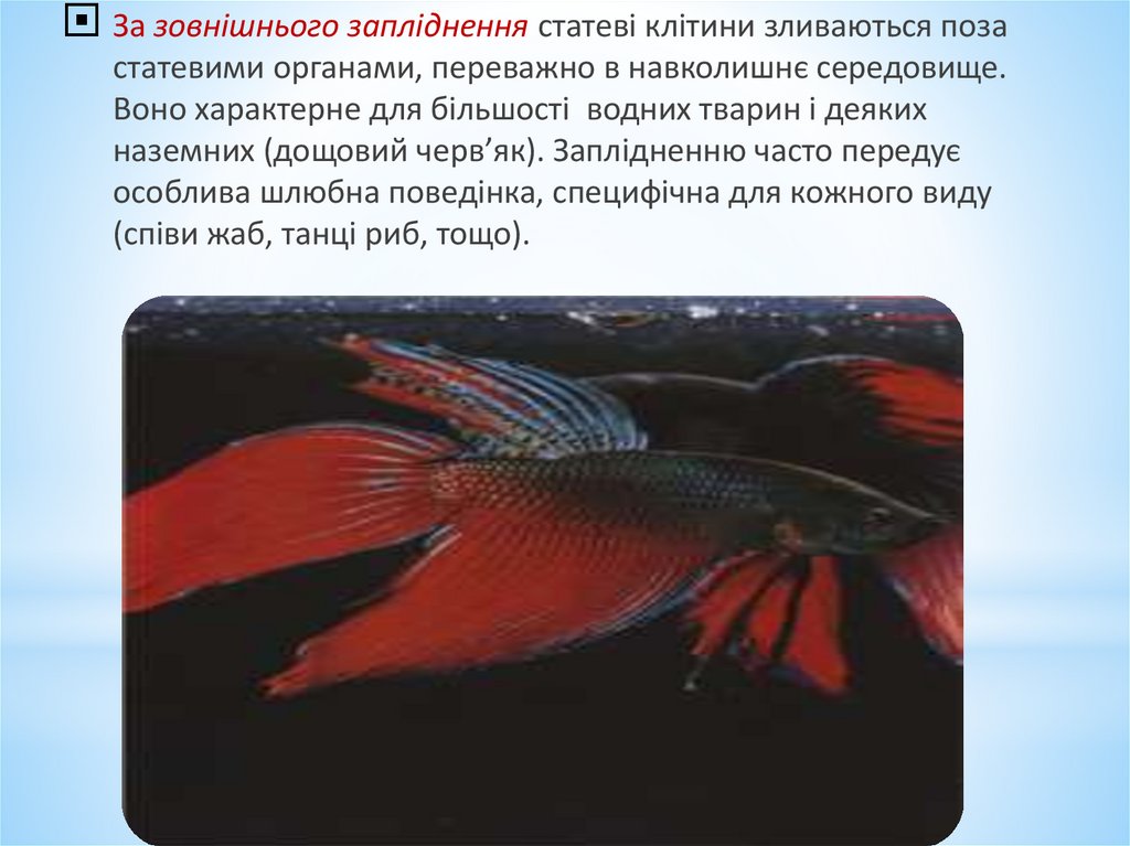 За зовнішнього запліднення статеві клітини зливаються позастатевими органами, переважно в навколишнє середовище.