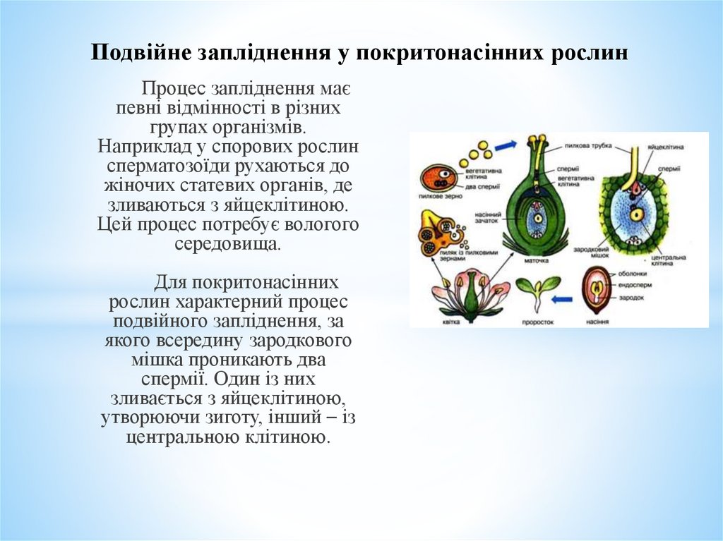 Подвійне запліднення у покритонасінних рослинПроцес запліднення має