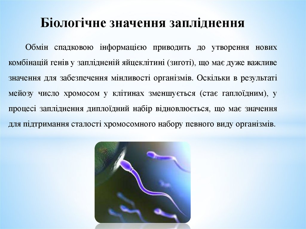 Біологічне значення заплідненняОбмін спадковою інформацією приводить до утворення нових