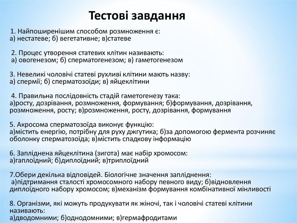 Тестові завдання1. Найпоширенішим способом розмноження є:
