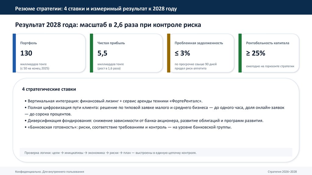 Резюме стратегии: 4 ставки и измеримый результат к 2028 годуРезультат 2028 года: масштаб в 2,6 раза при контроле риска