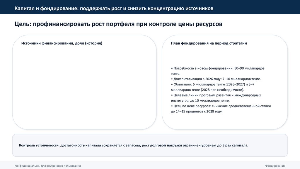 • Диверсификация фондирования: снижение зависимости от банка‑акционера, развитие облигаций и программ развития.
