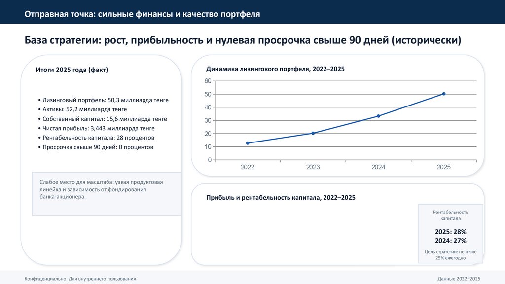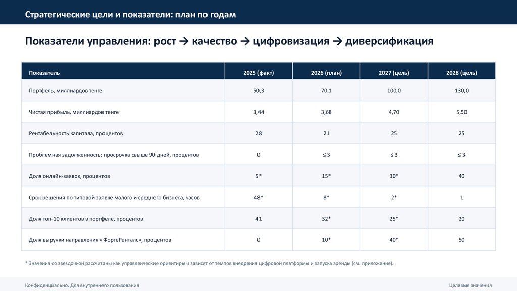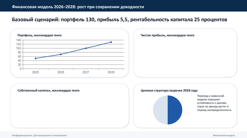 • Рост портфеля: 50,3 → 70,1 → 100 → 130 миллиардов тенге (ориентир среднегодового роста около 38 процентов).
