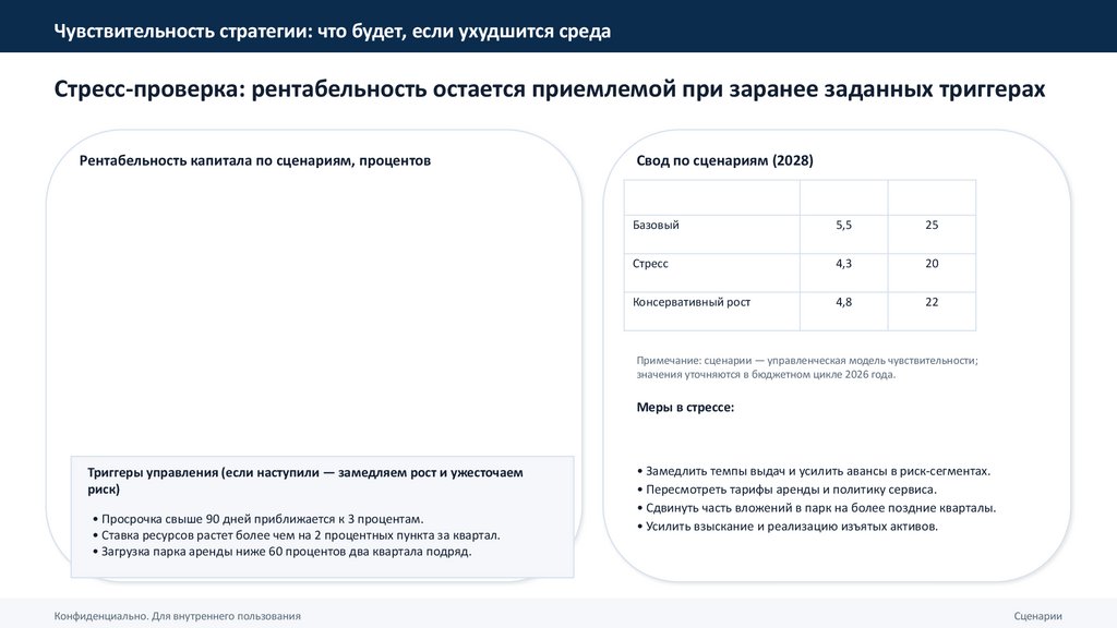 • Чувствительность: в стрессе (просрочка 5 процентов и рост ставки ресурсов) рентабельность капитала около 20 процентов — выше внутреннего минимума в 18