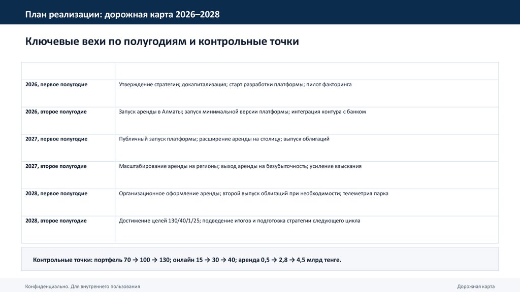 Контрольные точки: портфель 70 → 100 → 130; онлайн 15 → 30 → 40; аренда 0,5 → 2,8 → 4,5 млрд тенге.