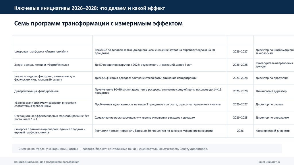• Стратегический комитет: ежеквартально — статус инициатив и отклонения.