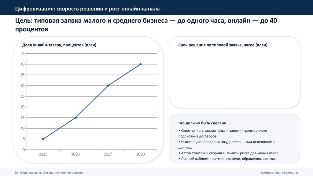 • Цифровизация: онлайн‑доля и срок решения заданы как управленческие ориентиры с привязкой к этапам внедрения платформы.