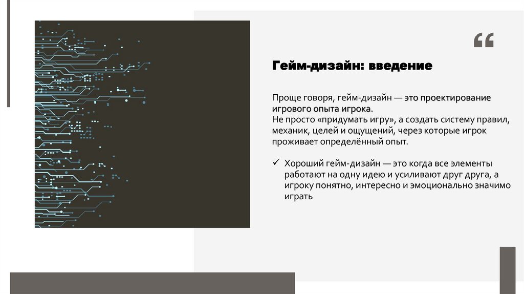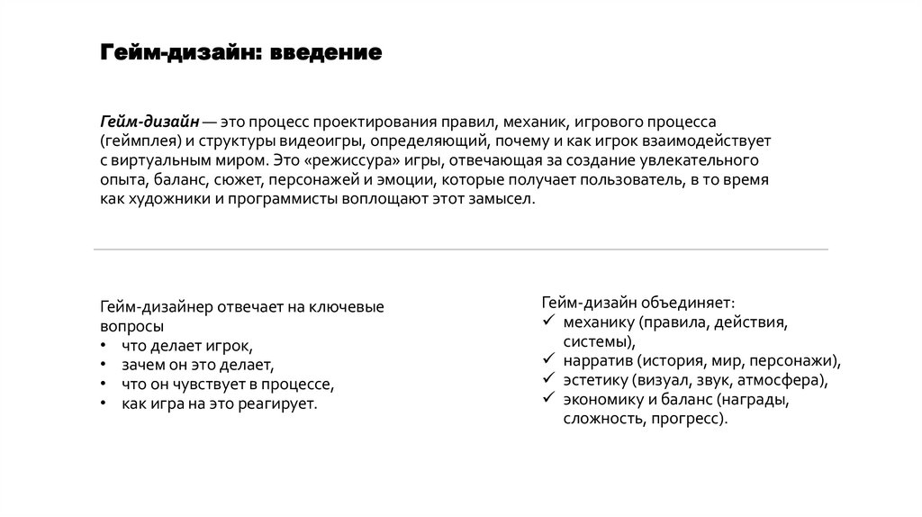 Гейм-дизайн: введениеГейм-дизайн — это процесс проектирования правил, механик, игрового процесса