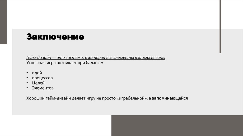 ЗаключениеГейм-дизайн — это система, в которой все элементы взаимосвязаны